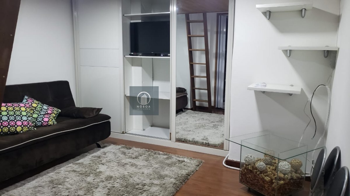 - Sala mobiliada: TV, guarda-roupa embutido, sofá-cama, mesa, ventilador, tapetes e almofadas.